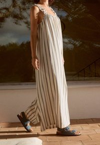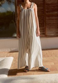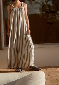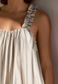 Combinaison à rayures avec bretelles volantes à volants, encolure élastiquée, deux poches latérales, rayures verticales blanches et grises, tissu léger.
