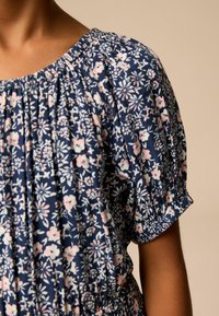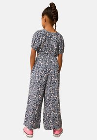 Combinaison fleurie avec un fond bleu marine, dotée de manches courtes bouffantes et de côtés découpés. Associée à des baskets roses avec des lacets blancs.