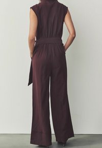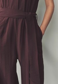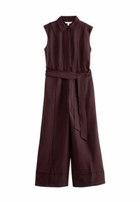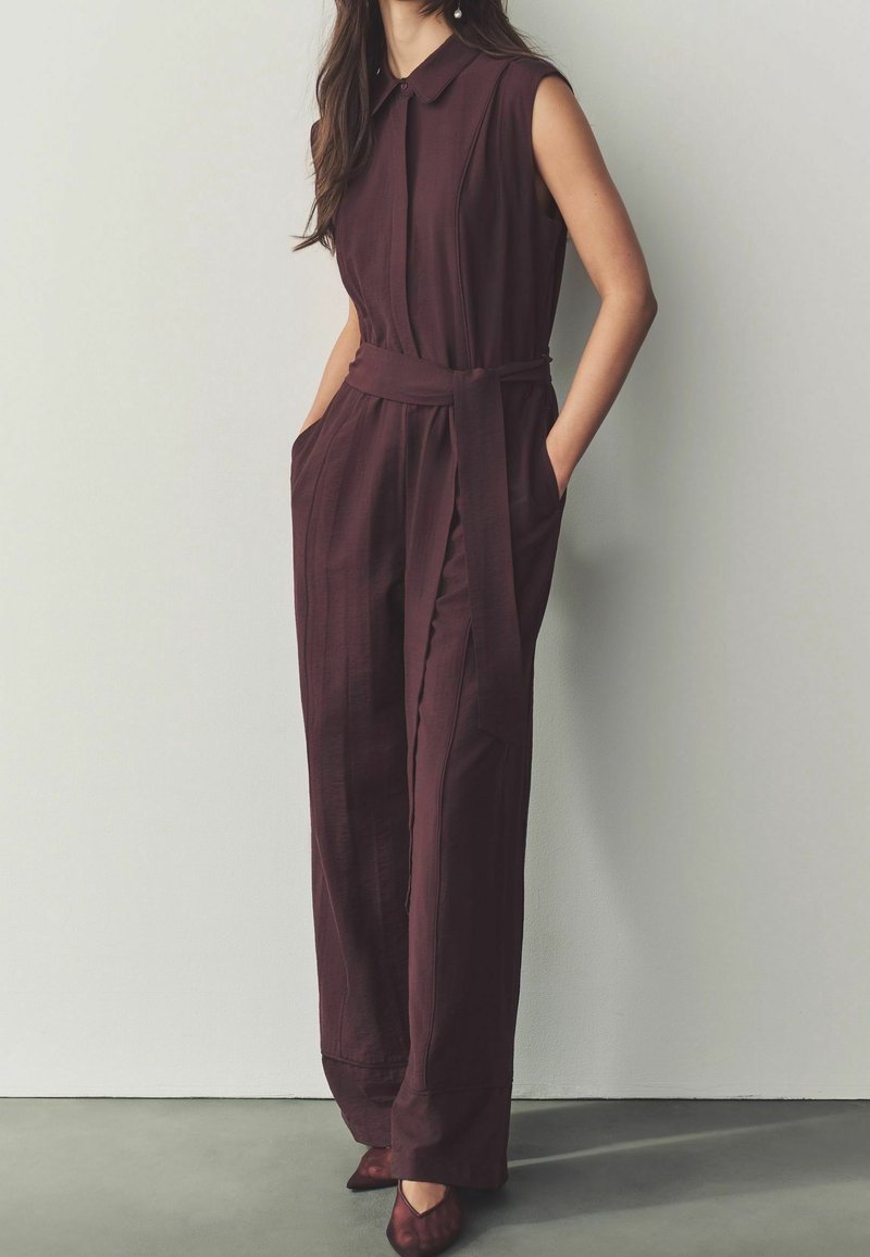Combinaison sans manches de couleur violet foncé avec col, ceinture à nouer à la taille, jambes larges et poches, portée avec des chaussures pointues assorties.