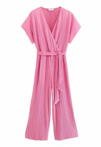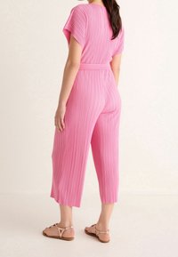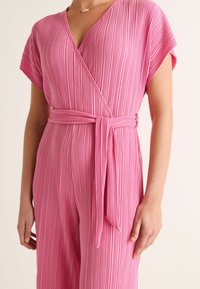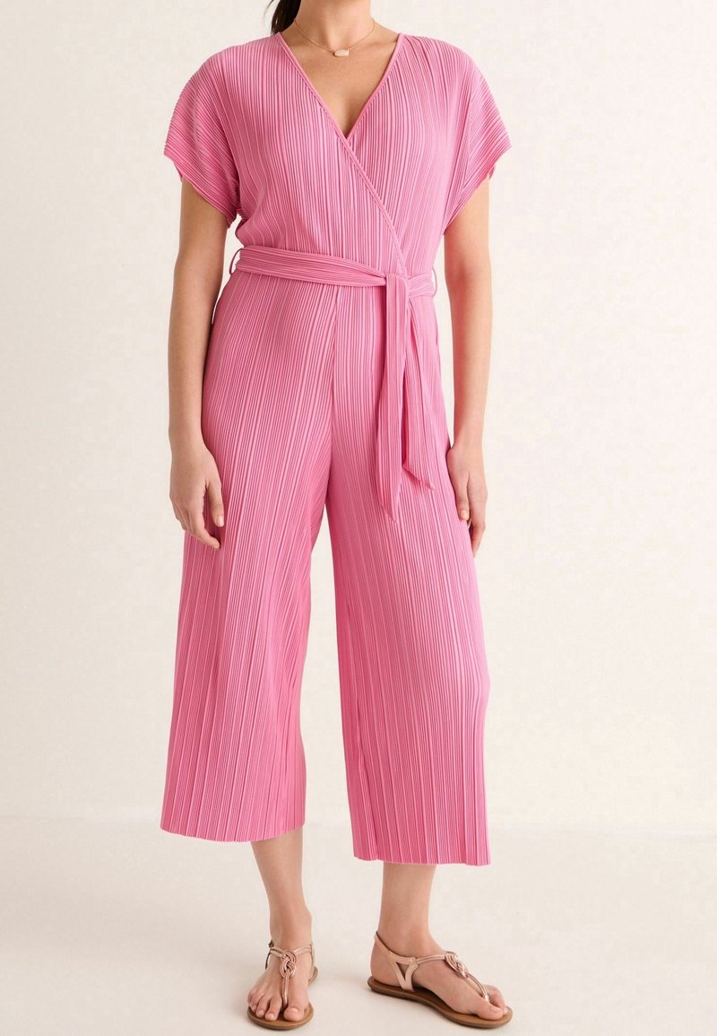 Femme portant une combinaison cache-cœur rose plissée avec des manches courtes, des jambes larges et raccourcies, une ceinture nouée à la taille, et des sandales plates beige.