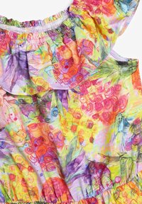Enfant portant un haut coloré à fleurs à épaules dénudées avec des volants et un short assorti, sur un fond clair uni.
