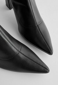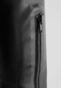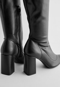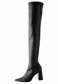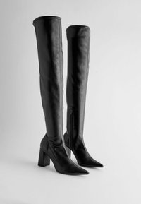 Botte haute en cuir noir avec bout pointu et talon haut épais, s'étendant au-dessus du genou.