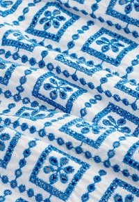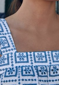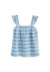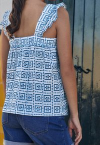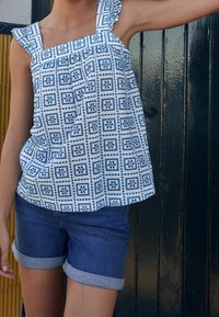 Débardeur à motifs bleus et blancs avec bretelles volantées et coupe droite, accompagné d'un short en jean retroussé. Tissu léger avec motif géométrique.