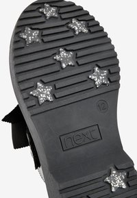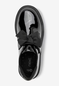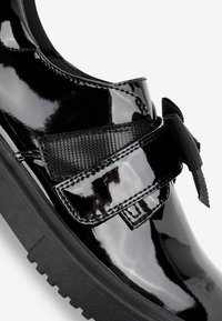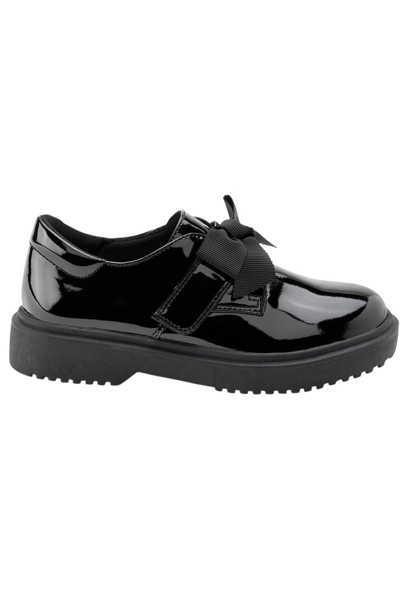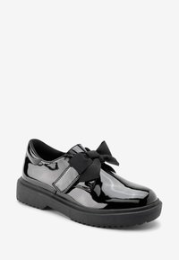 Chaussure en cuir verni noir avec semelle en caoutchouc épaisse et large ruban noir noué en un nœud sur le dessus.