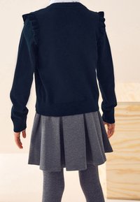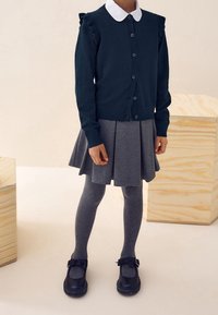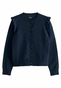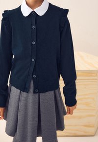 Cardigan bleu marine avec poignets côtelés et boutons, porté sur une robe en vichy bleu clair avec un col orné de dentelle blanche.