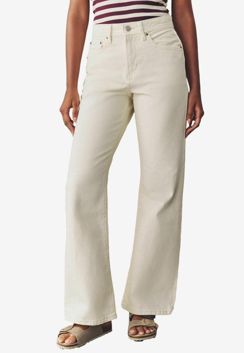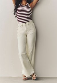 Femme portant un pantalon crème à taille haute et jambes larges avec poches avant et fermeture à boutons, associé à des sandales beiges à bout ouvert.
