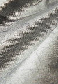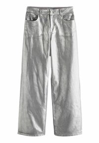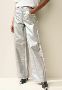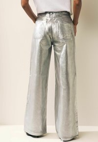 Personne portant un pantalon large argenté brillant avec des poches avant, associé à des bottines noires à talons pointues et un haut blanc.