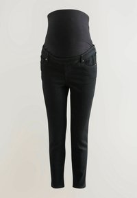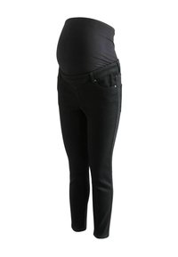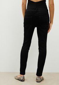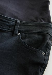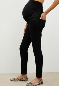 Personne enceinte portant un jean de maternité noir avec une ceinture extensible et des chaussures plates à motif peau de serpent, debout de profil.