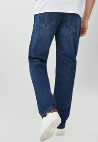 Homme portant un jean droit bleu marine, des baskets blanches et un t-shirt blanc, debout avec une main dans la poche.