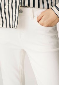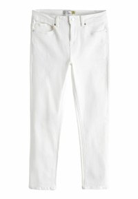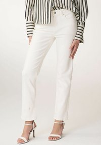 Jean blanc à jambes droites avec une texture lisse, doté d'une taille haute, de détails de couture subtils et d'un ourlet légèrement effiloché à la base.
