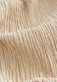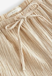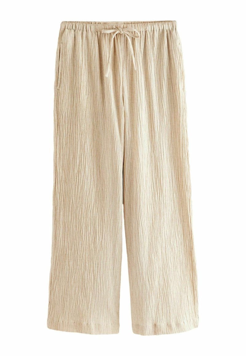 Pantalon beige clair à jambes larges en tissu texturé, avec une taille élastique et un cordon de serrage pour un ajustement réglable.