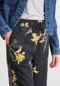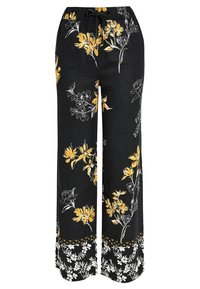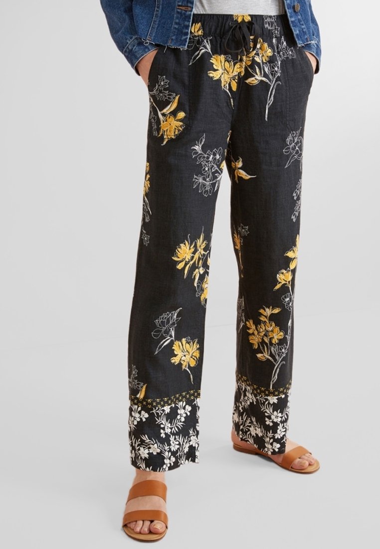 Pantalons noirs à imprimé floral avec des motifs jaunes et blancs. Coupe ample, taille élastique à cordon, avec un ourlet à motifs. Portés avec des sandales marron.