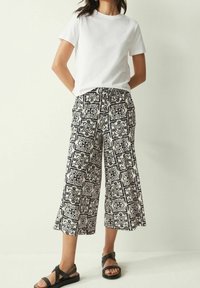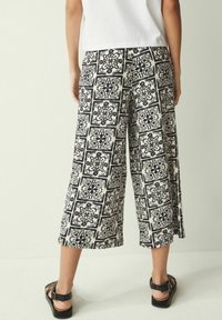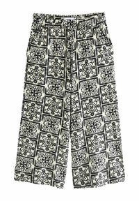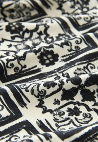 Pantalons larges à motifs noir et blanc avec une taille à cordon, présentant des motifs floraux complexes disposés en carreaux, assortis à des sandales noires.