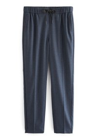 Pantalon bleu à motifs avec taille élastique à cordon, poches latérales et coupe slim. Associé à des mocassins noirs à finition texturée.