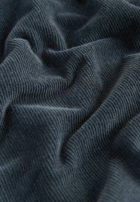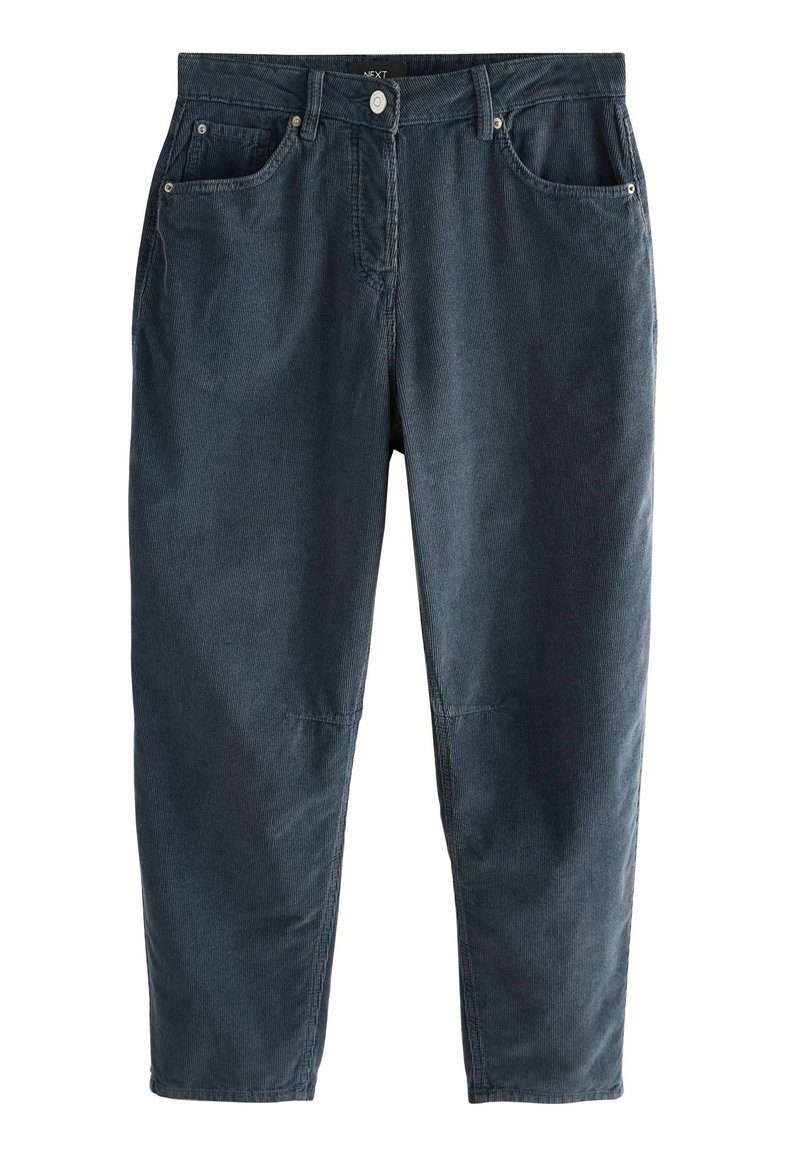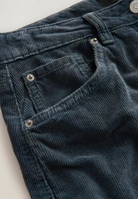 Pantalon en velours côtelé bleu foncé à coupe décontractée, avec une ceinture plate, cinq poches et des accents de ferrures argentées.