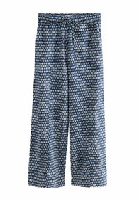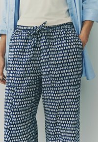 Personne portant un pantalon ample à motifs bleu et blanc avec taille à cordon, mains dans les poches, associé à des sandales à talons beiges.