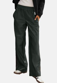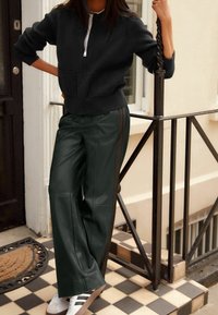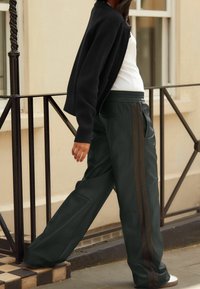 Pantalon noir à jambes larges avec taille élastique porté avec des baskets blanches et une veste noire, les mains dans les poches, sur un fond blanc.