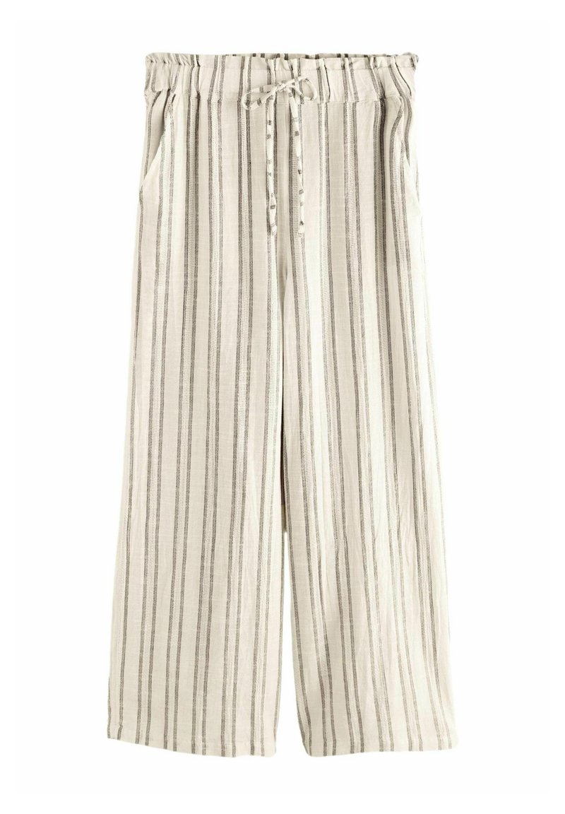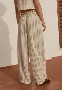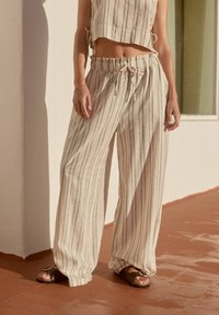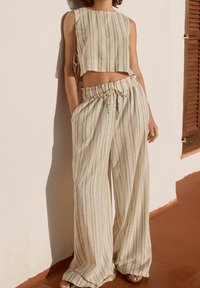 Pantalons larges beige clair avec des rayures verticales grises, taille élastique, poches latérales et lien de serrage à l'avant.