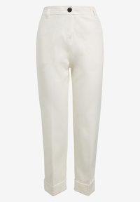 Pull bleu clair avec un détail de couture dans le dos, associé à un pantalon crème et des mocassins imprimés léopard, le tout sur fond d'un chemin en pierre.