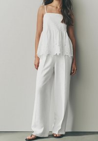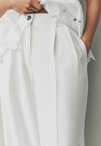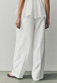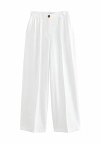 Pantalon blanc à jambes larges et taille haute, avec une fermeture à boutons sur le devant et des plis, confectionné dans un tissu léger.