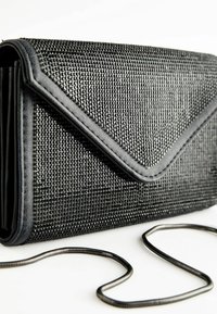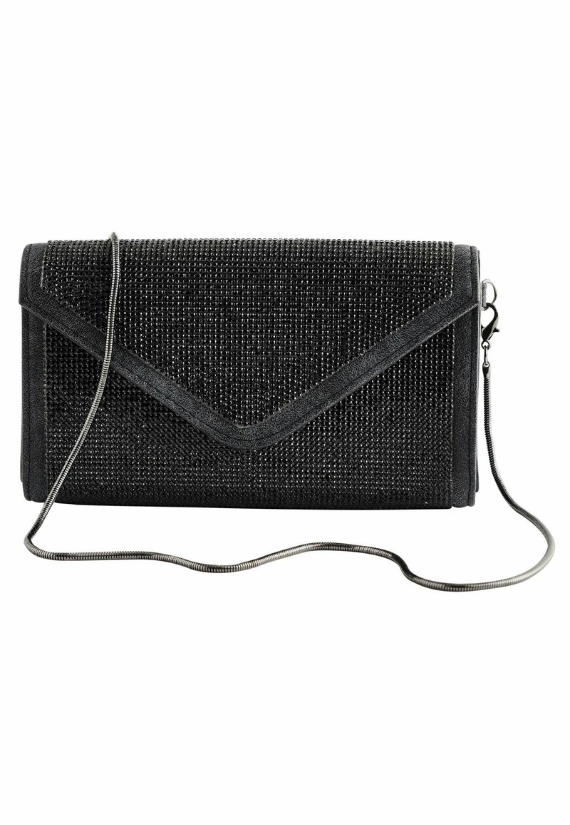 Pochette rectangulaire noire avec des détails en strass et une fine bandoulière en chaîne argentée, dotée d'un rabat de style enveloppe.