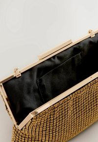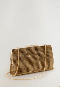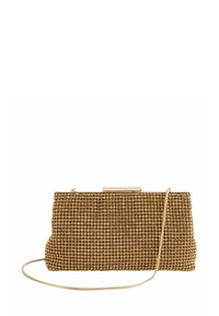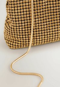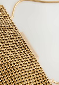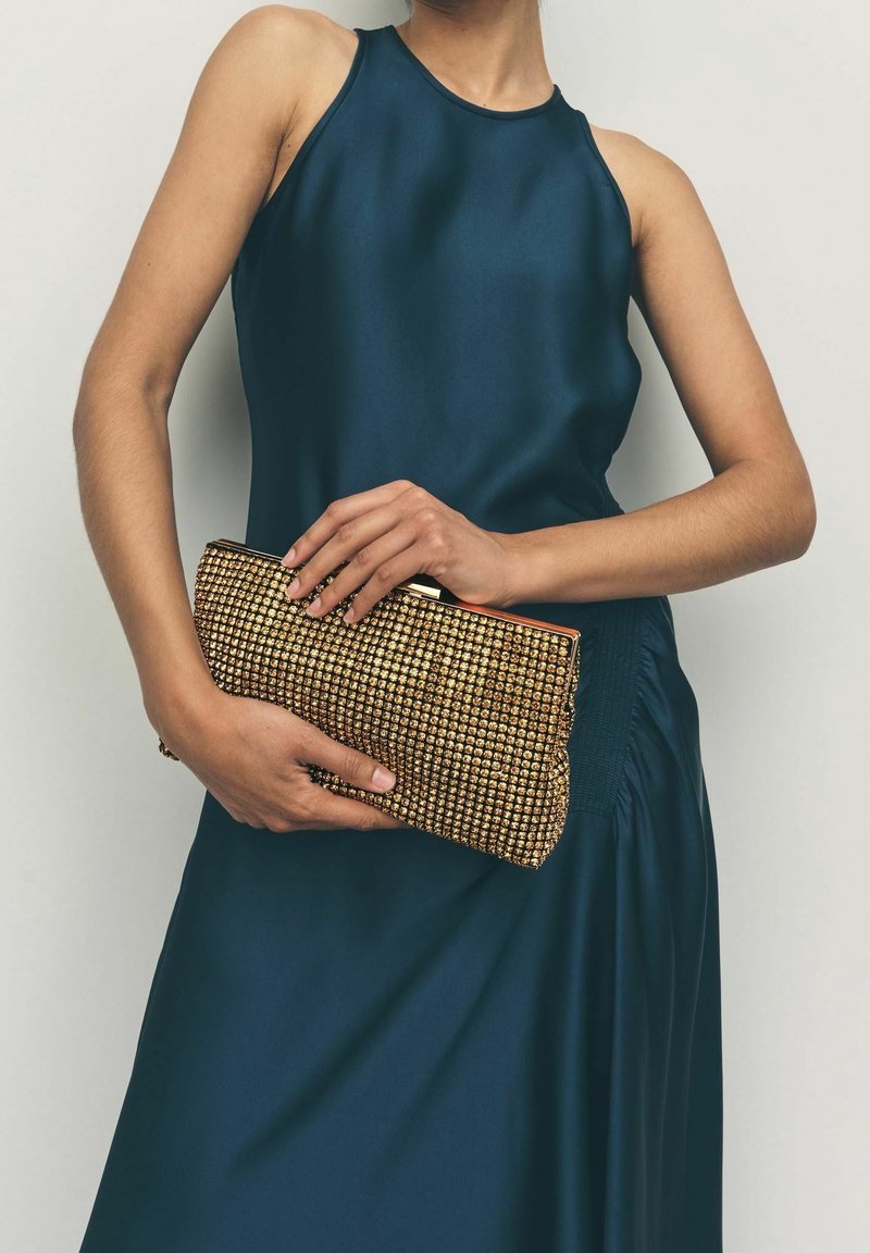 Femme en robe sans manches bleu sarcelle foncé tenant une pochette rectangulaire en maillage doré sur un fond uni.