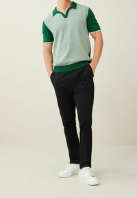 Homme portant un polo à manches courtes à rayures vertes et blanches avec un pantalon sombre, debout devant un fond uni clair.