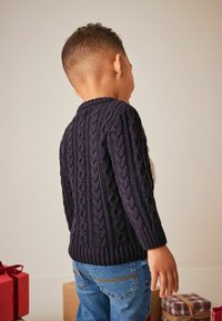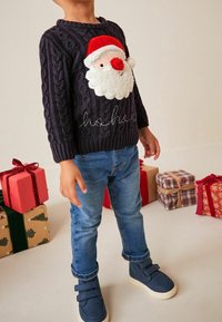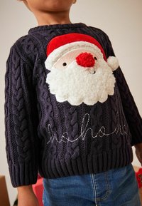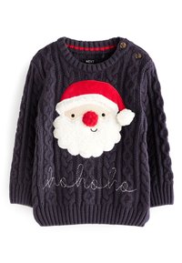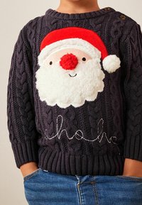 Gros plan sur un pull sombre tricoté avec un visage de Père Noël texturé, comprenant un chapeau rouge, un nez rond rouge, une barbe blanche duveteuse et un pompon.