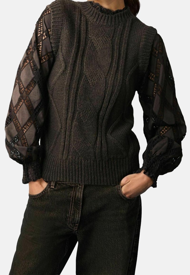 Pull en maille foncé avec motifs torsadés texturés ; manches bouffantes transparentes ornées d'un motif en losange en dentelle ; ourlet et poignets côtelés.