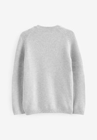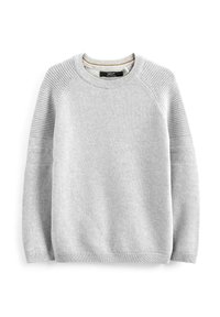 Pull en maille gris clair avec un col rond, des manches raglan et des détails texturés en accent sur les épaules et les manches.