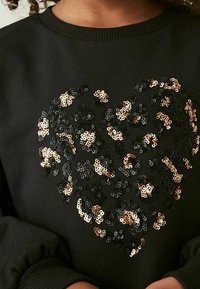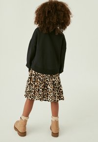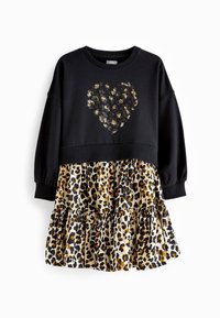Sweat-shirt noir avec un motif de cœur, associé à une jupe en tiered imprimé léopard. Le mannequin porte des bottines beiges avec des zips et des chaussettes crème.