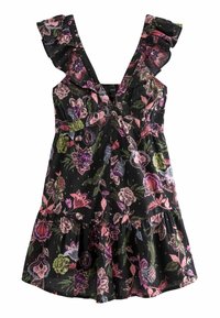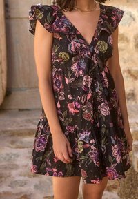 Robe florale noire avec un décolleté en V profond, des manches volantées et une jupe à plusieurs niveaux, ornée de motifs floraux colorés et de subtils accents métalliques.