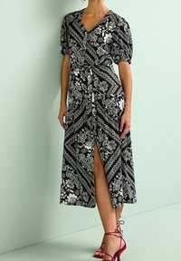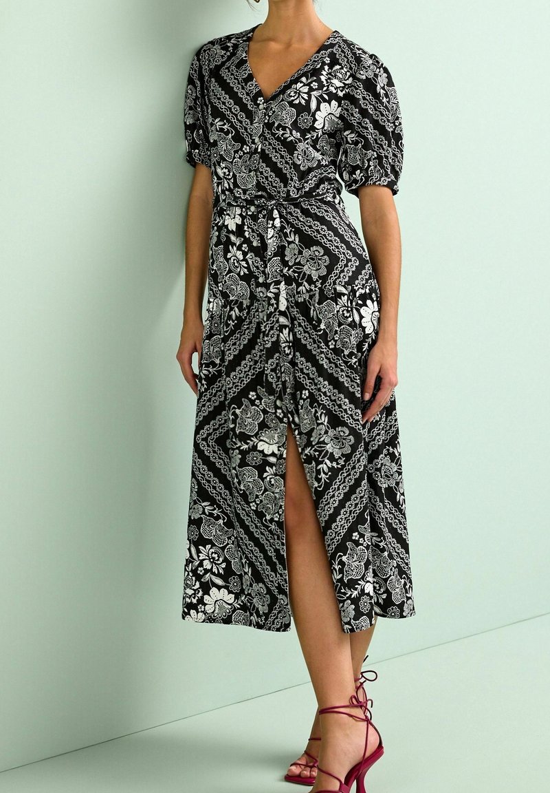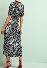 Robe maxi imprimée florale en noir et blanc avec un col en V, des manches bouffantes et une fente haute sur la cuisse. Associée à des talons à brides bordeaux.
