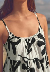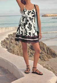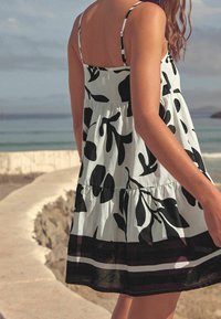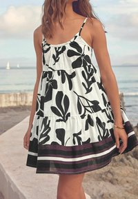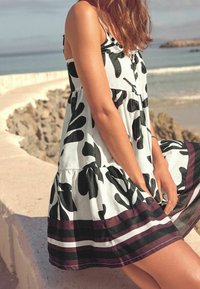 Robe fleurie en noir et blanc avec des volants superposés, des bretelles fines et un ourlet accentué de bordeaux. Portée avec des sandales noires sur un sentier côtier.