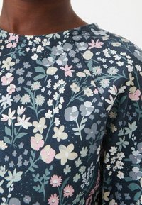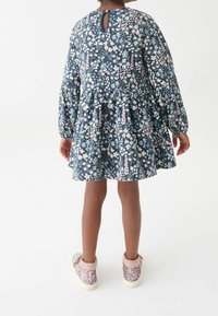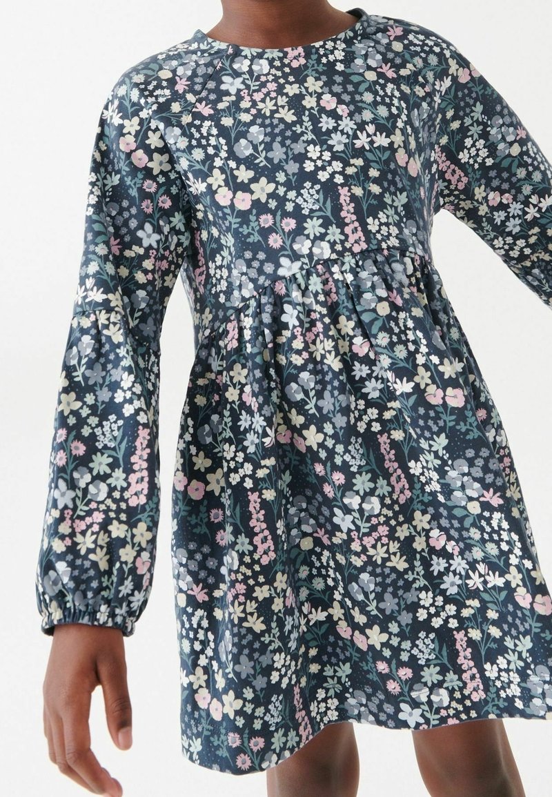 Robe imprimée florale avec un fond bleu marine et des fleurs multicolores, manches longues bouffantes et taille froncée. Tissu doux en mélange de coton.