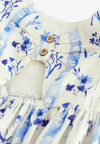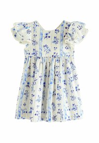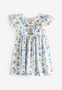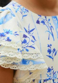 Robe florale bleu clair avec de courtes manches volantées et un bord en dentelle. Le motif présente des rayures verticales et des fleurs bleues éparpillées sur un fond beige.