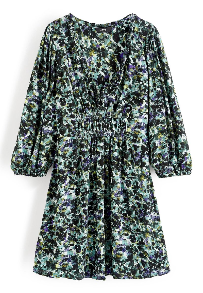 Robe à imprimé floral avec un col en V plongeant, base noire et accents verts, violets et bleus. Présente des manches bouffantes et un détail de taille smockée.