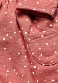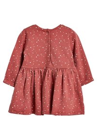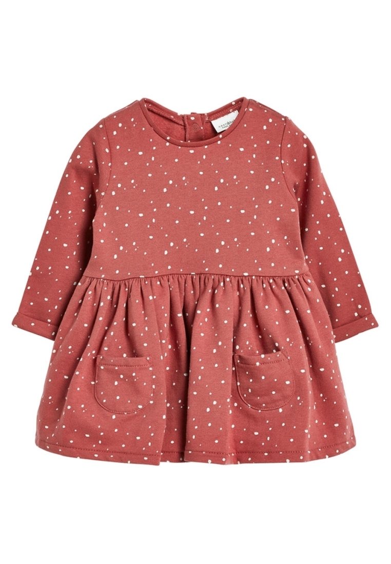 Robe à manches longues rougeâtre avec des pois blancs, dotée d'une jupe froncée et de deux poches avant, fabriquée en coton doux.
