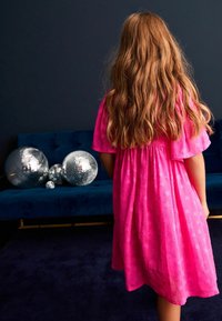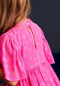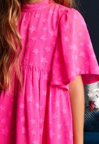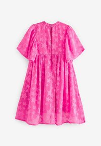 Robe rose à motifs d'étoiles avec manches courtes bouffantes, dotée d'une taille froncée et d'une jupe fluide. Tissu doux et texturé ajoutant de la finesse.