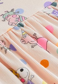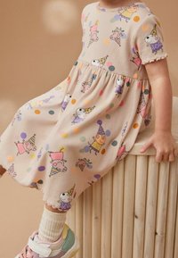 Robe à manches courtes en tissu côtelé doux avec une base beige clair et des pois colorés. Elle présente des personnages de dessins animés ludiques et un ourlet festonné.