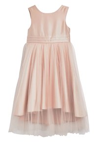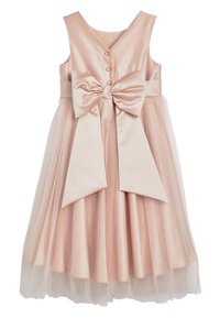 Robe sans manches en satin rose poudré avec jupe en tulle, ornée d'un grand nœud en satin et de trois boutons recouverts de tissu sur le corsage.