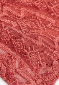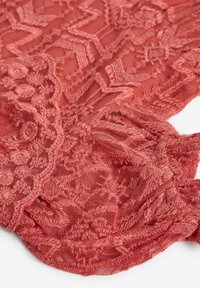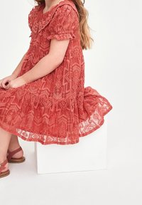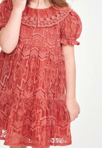 Robe en dentelle corail avec de courtes manches bouffantes, col festonné, jupe à volants et un motif floral texturé. Sandales brunes avec des accents froncés.