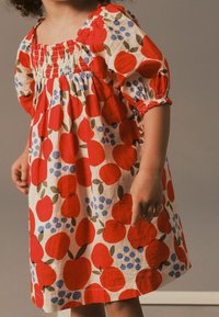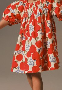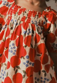 Robe en coton à motif de fruits rouges et bleus, avec des manches courtes bouffantes et un col smocké, ornée de motifs de pommes et de baies sur un fond crème.