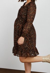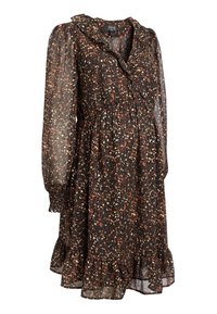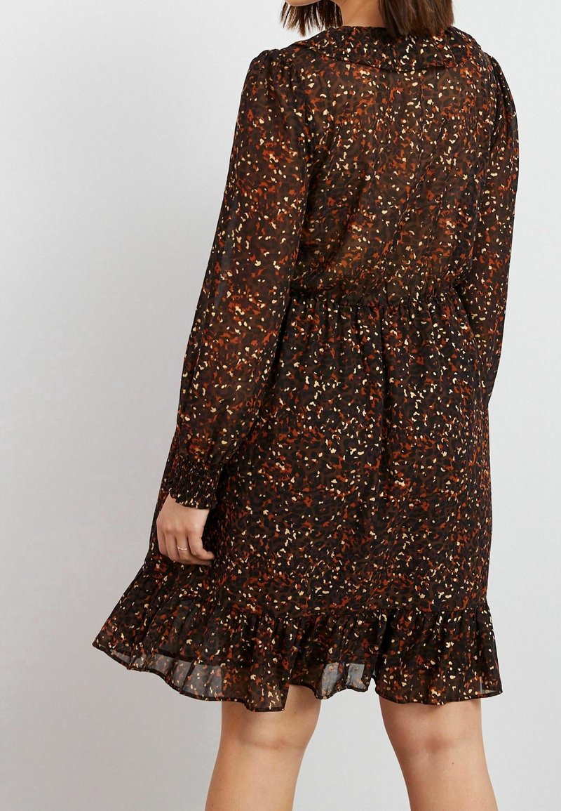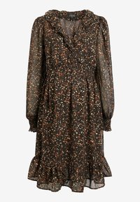 Robe noire avec motifs abstraits colorés, manches longues, taille élastique et ourlet à volants. Fabriquée en tissu transparent et léger.