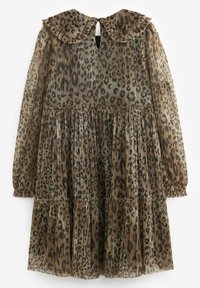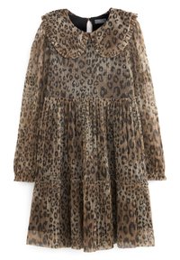Robe imprimé léopard avec un design plissé, manches longues et col à volants ; associée à des ballerines roses brillantes sur un sol couvert de confettis.