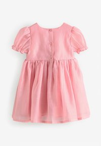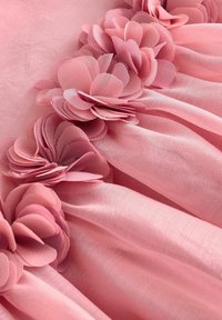 Robe rose avec manches courtes bouffantes, un col rond et un ruban floral accentuant la taille. Confectionnée en tissu léger avec une jupe fluide.