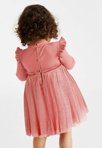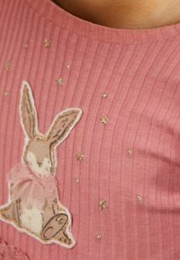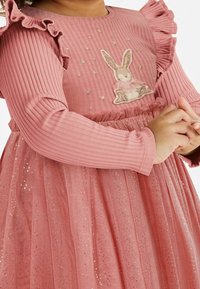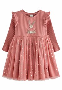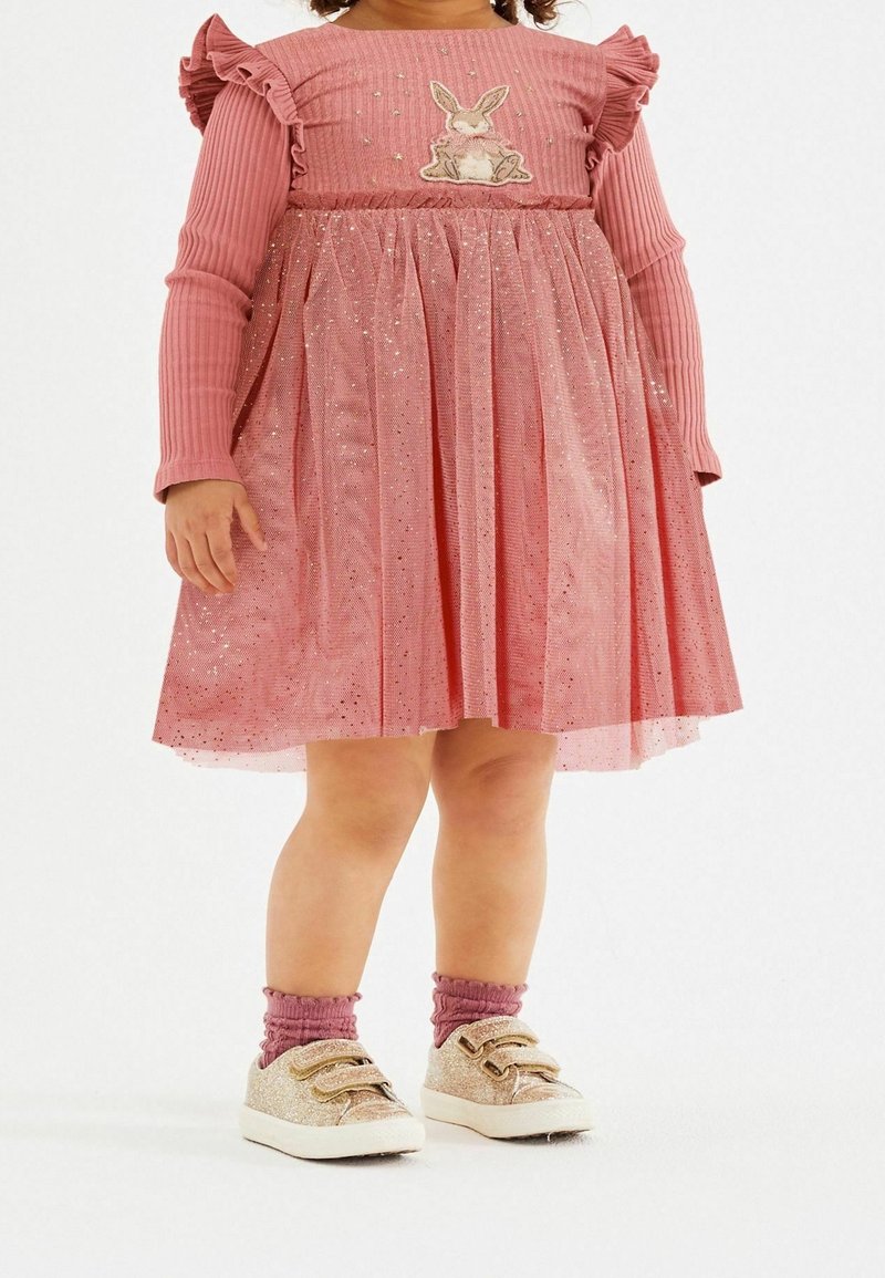 Tout-petit portant une robe à manches longues rose avec un motif de lapin, une jupe en tulle pailletée, des chaussettes roses et des baskets dorées brillantes à scratch.