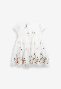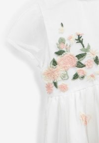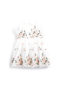 Robe blanche ornée de broderies florales en rose et vert. Manches courtes, matière en tulle, et jupe à volants. Fermeture par boutons dans le dos.