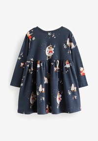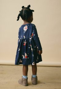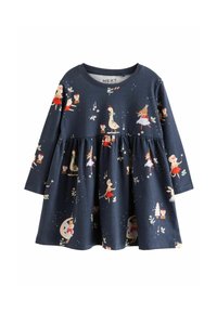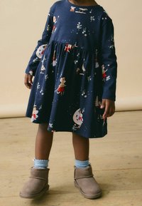Robe bleu marine à manches longues avec une jupe froncée ornée de personnages imprimés, associée à des bottines grises et des chaussettes côtelées bleu clair.