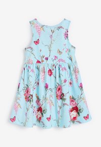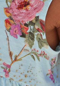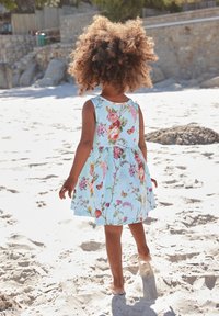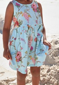 Robe sans manches bleu clair à motif floral rose et vert, jupe fluide et taille froncée, portée pieds nus sur un terrain sablonneux.